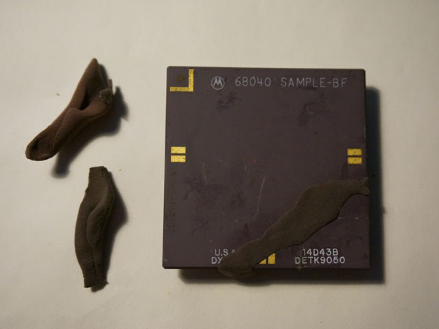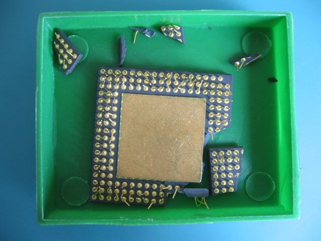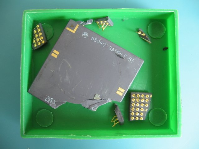 网友"笑颜"买了一些洗金货,里面有一颗摩托罗拉68040的ES,可惜收到时已经碎成N块了,能找到的就8块。他想出给洗金的,我觉得怎么说也是个ES,就这么销毁可惜了。于是买了过来,准备修复一下,尽可能的恢复原来的面目。这是收到时的情形,很惨啊。