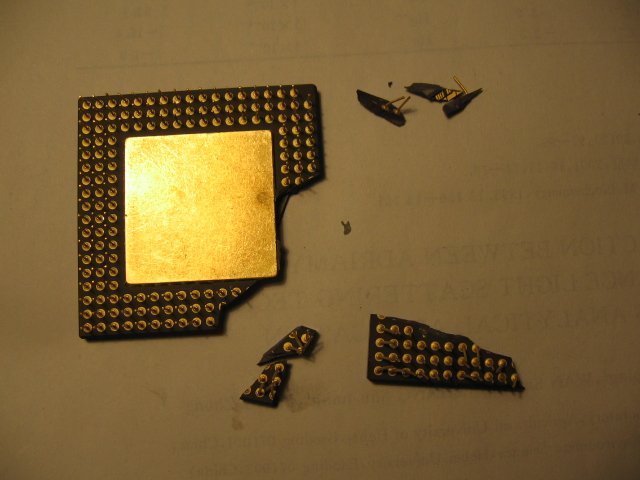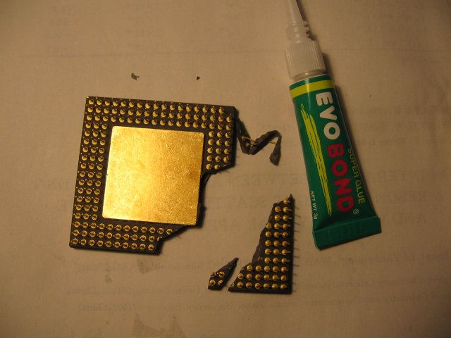 这个CPU还算不错的,碎的是一个角,至少大部分还是完整的。先把针脚掰直。