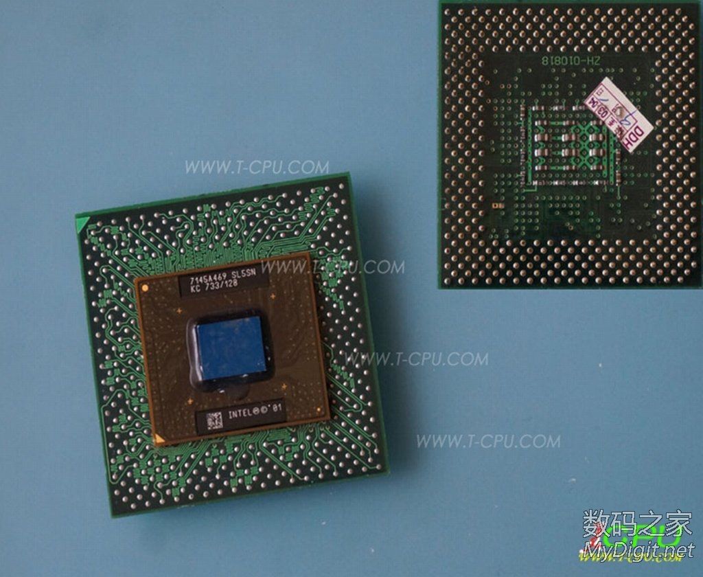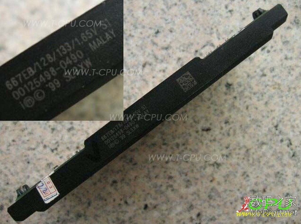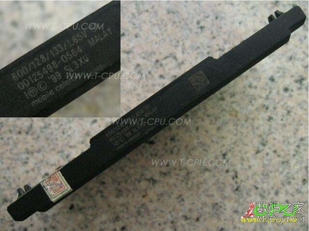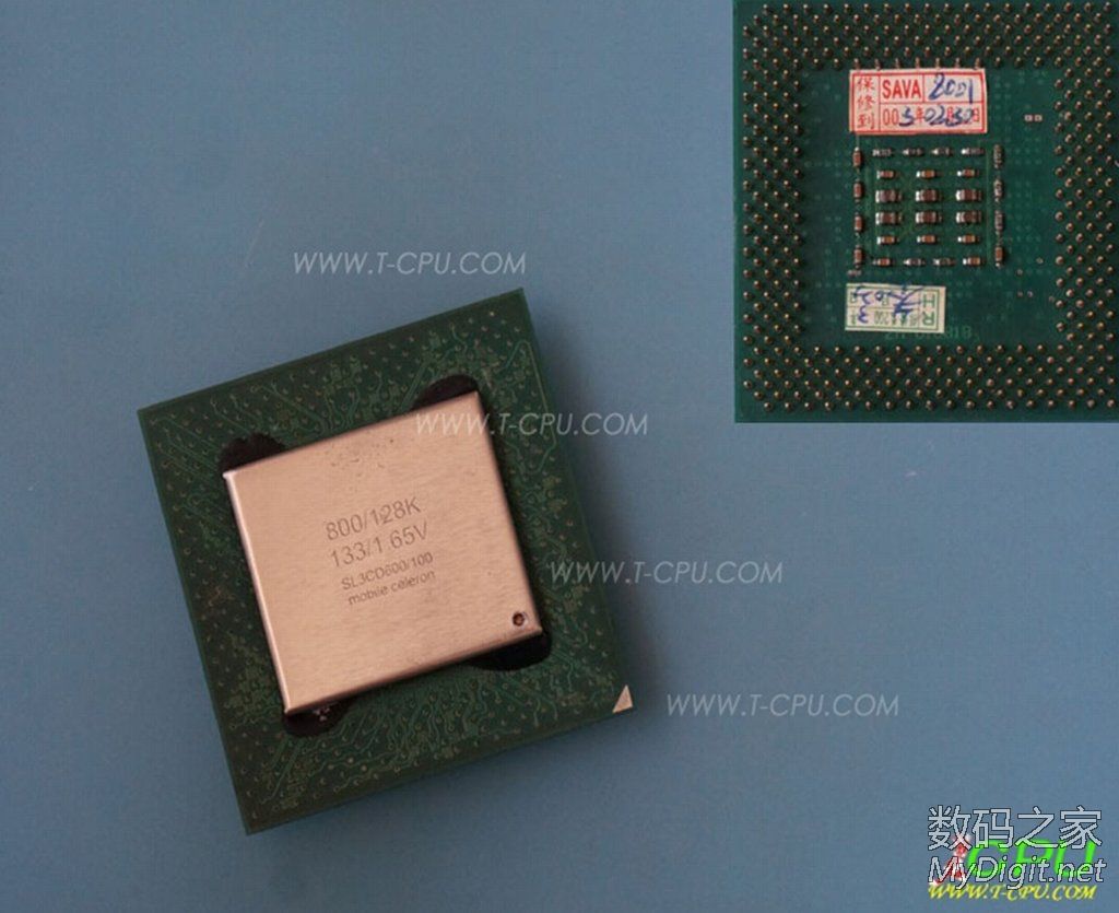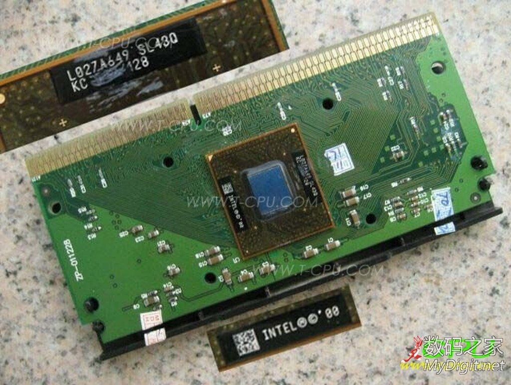 这类假货外表很唬人,猛一看和正品PIII没啥区别。可是128的缓存出卖了它,PIII有出过128缓存的吗?再看里面的芯片,这明明就是拿Micro-BGA移动版赛扬加了个转接卡嘛。有的壳上印着英文移动赛扬,本身就说明了问题。Intel也没有出过这样的赛扬。