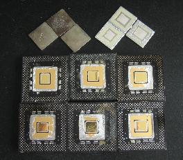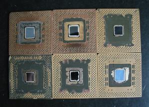 这是剩下的塑料片基,核心还在上面,核心大一些的三个是奔腾MMX,小的是不带有MMX功能的奔腾。可以看到上排左面两个核心周围还有镀金层没有弄下去,不过我已经没有耐心了。而且核心的下面有可能还有镀金层,这种U有可能都是打碎了提金的。