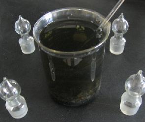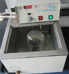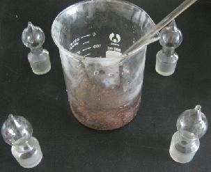 然后把掀了盖的六块黑金刚放到烧杯中,加上酸,再扣上一个大烧杯做成一个简易水封。这次用了和第二次试验不同的酸,而且我把烧杯放入设定80度的恒温水浴中,想借此加速反应。不过在80度条件下反应一下午后,我还是失望了,看来反应慢的问题还是没有解决。结果这个反应又在室温条件下进行了两个星期才基本完成。现在我觉得洗金的人是否也像烧砖一样,挖个池子,把U和酸倒入,然后封池,过半个月再挖开,有这可能吗。