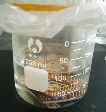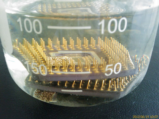 然后将两块386 CPU泡在液体中。这个反应很慢,这一泡估计又是3、4个月。386的金镀层应该比486更厚,耐腐蚀性更强。相比之下,还是黑金刚等塑料板的CPU洗金反应快(耐腐蚀性不强),这也说明为什么军品U、工业用U需要陶瓷U并且用镀金片封的原因吧。