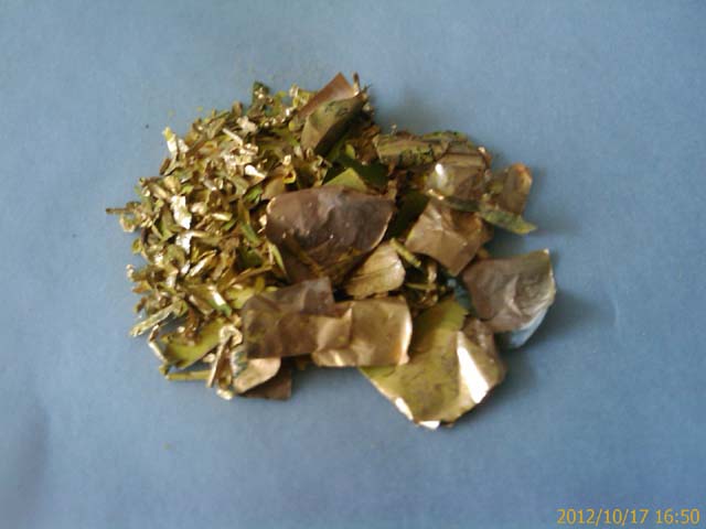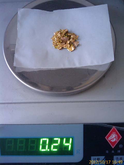 这一放就是几个月,今天(10月17号)把上星期取出晾着的金箔称了一下。泡得时间太长啦,金片上都有“铜绿”了。